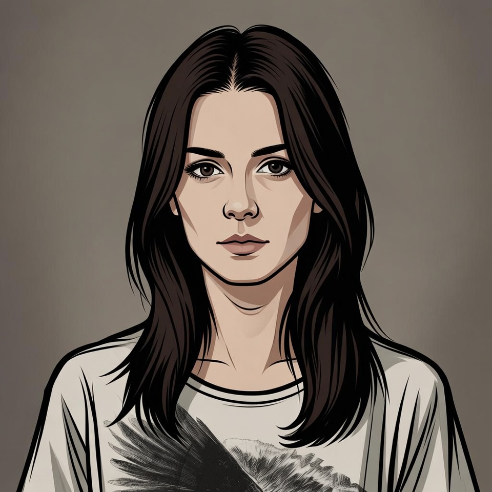 An illustration of a woman with long straight dark brown hair and a neutral expression faces forward on a gray background. She wears a white t-shirt featuring a large black raven. The artwork uses bold black outlines and minimal shading.