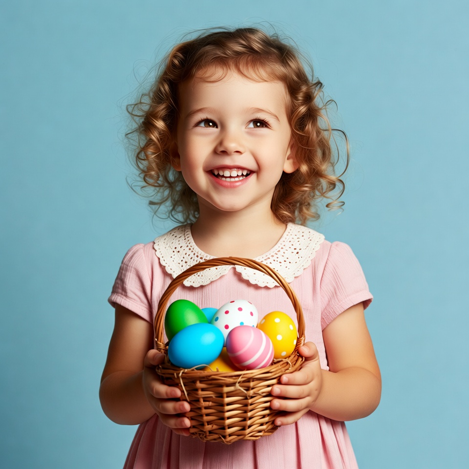 A young girl with curly brown hair smiles happily while holding a woven basket filled with colorful plastic Easter eggs. She wears a pink dress with white collar trim and stands against a solid blue background. The eggs in various bright colors like green, pink, blue, and yellow overflow from the basket.