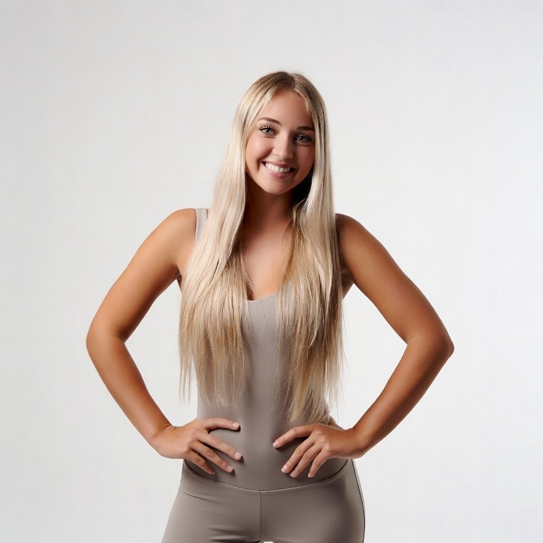 A young White woman with long straight blonde hair stands smiling confidently against a plain white background. She wears a form-fitting gray tank-style bodysuit and has hands on her hips. Her blue eyes and joyful expression are prominent.