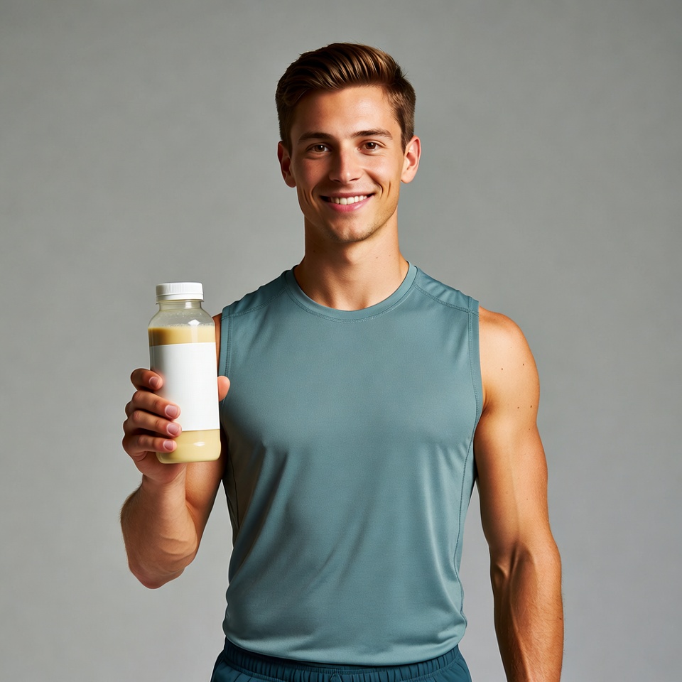 A young muscular man with short brown hair smiles while holding a white-labeled beige protein shake bottle. He wears a sleeveless teal tank top and dark shorts, standing against a plain gray background. His toned arms and athletic build are prominently displayed.
