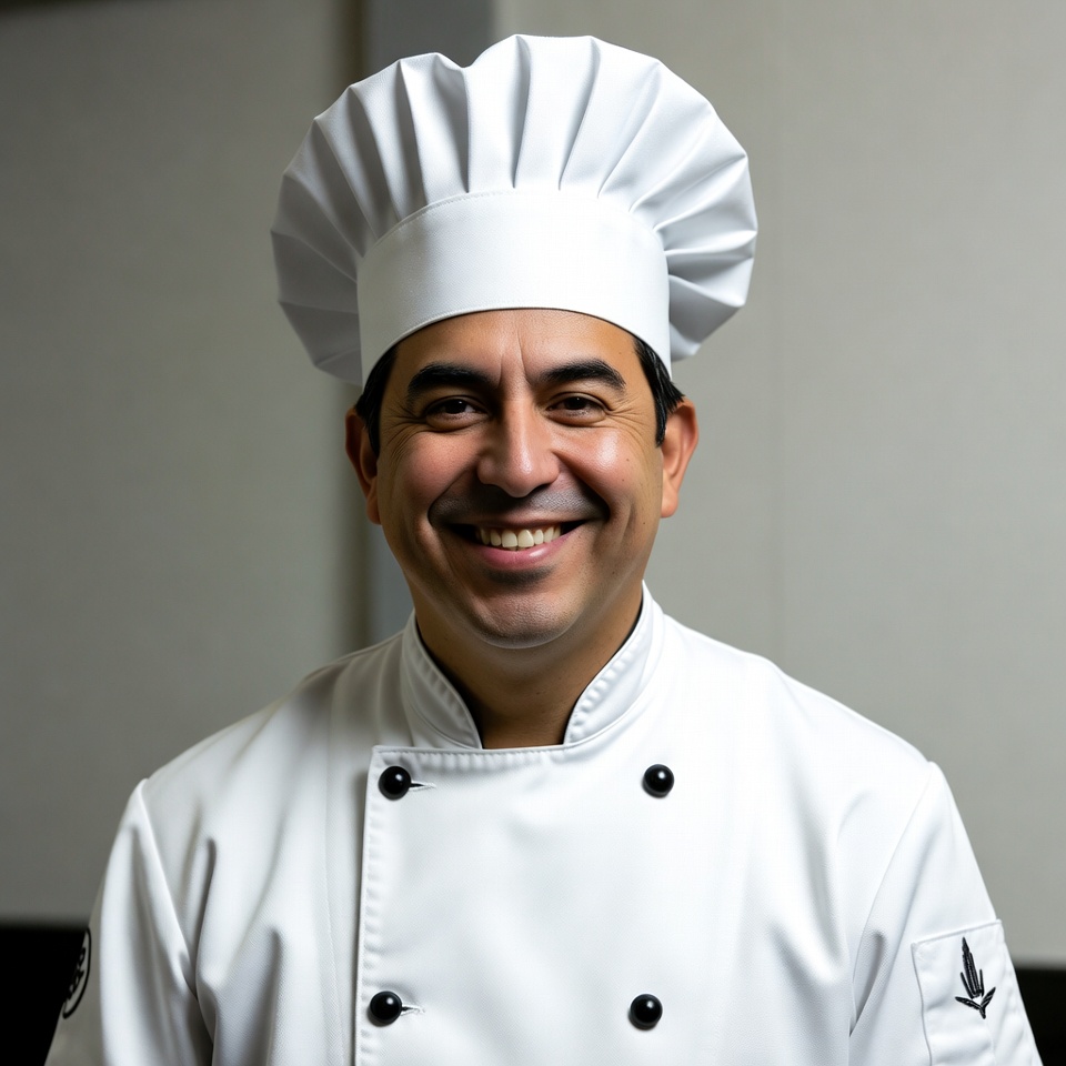 A Latino man with dark hair and a friendly smile wears a tall white chef's hat and a double-breasted white chef's jacket with buttons. He stands confidently against a plain light background. The jacket features a small emblem on the sleeve.