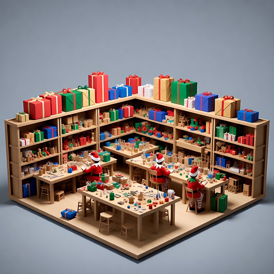 3D render, Christmas elves, Christmas toys, North Pole, Santa elves, Santa workshop, crafting tools, elf workers, festive, gifts, green outfits, holiday scene, illustration, presents, red hats, shelves, toy workshop, toys, wooden tables, woodworking, workshop, wrapped presents, elves