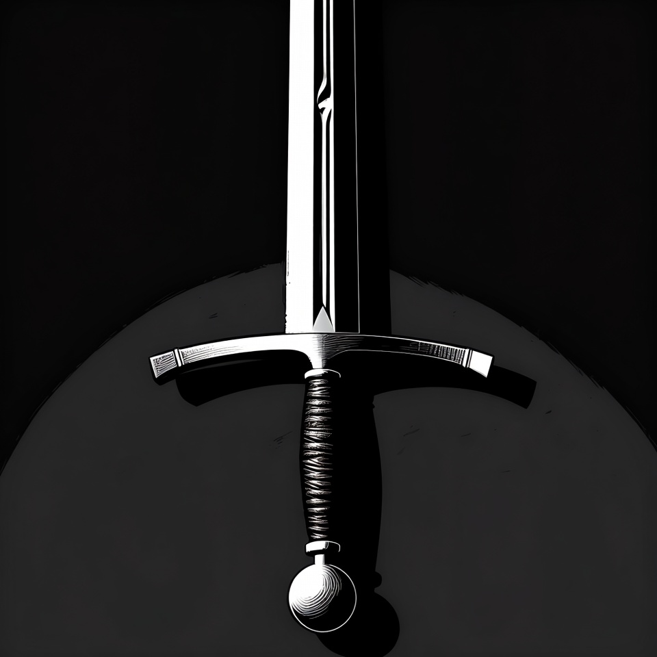 A detailed illustration of a medieval sword with a straight double-edged blade and cruciform hilt. The leather-wrapped grip ends in a spherical pommel, positioned vertically against a dark circular backdrop. High contrast lighting emphasizes the metallic sheen and sharp edges.