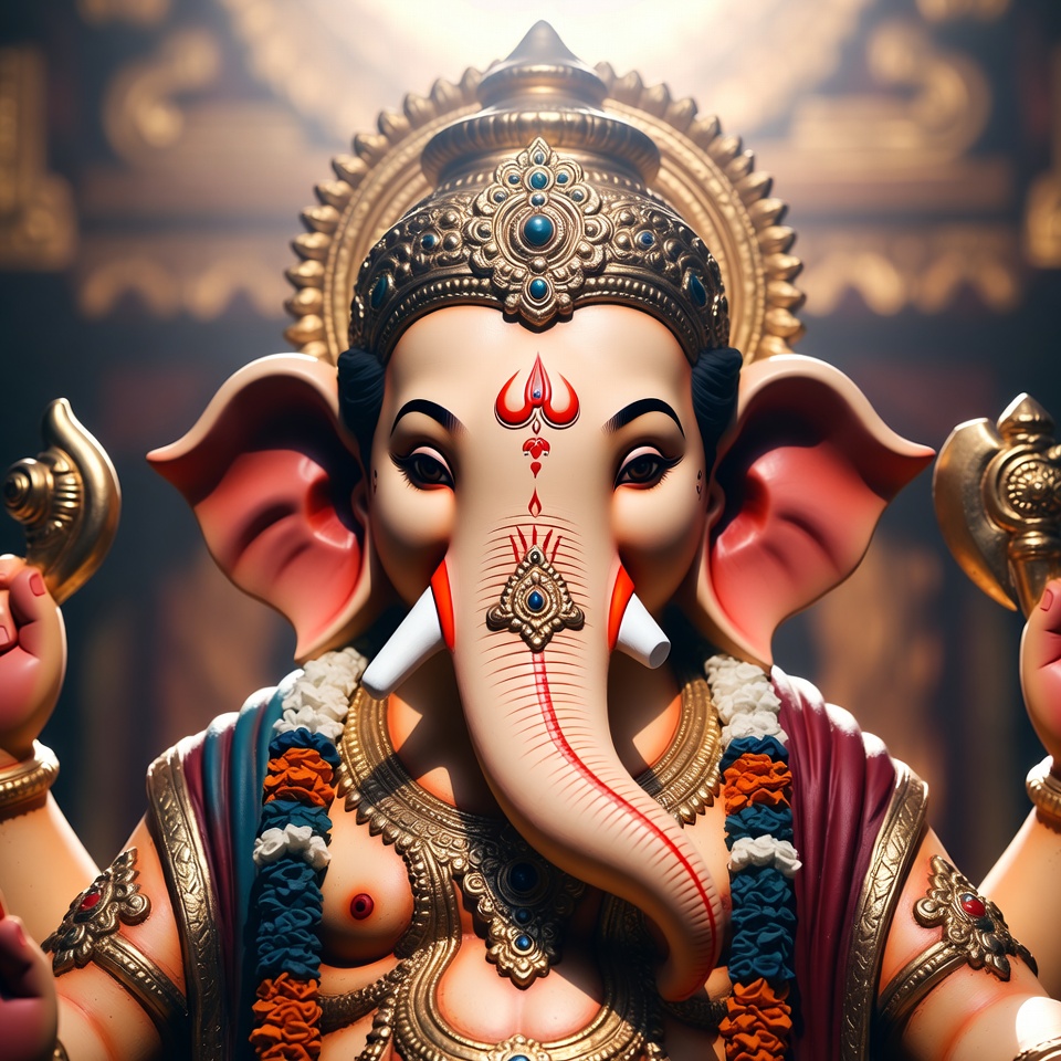 A detailed golden statue of Lord Ganesha, the elephant-headed Hindu deity, stands with a serene expression and large ears. He wears ornate jewelry, a crown, and traditional garlands in red and gold hues against a glowing dark background. His trunk curves gracefully, and his hands are adorned with divine symbols.