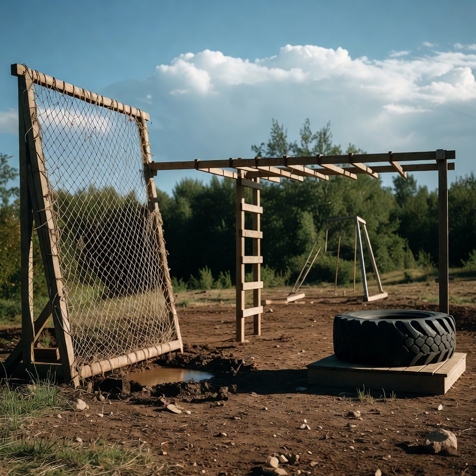 blue sky, cargo net, climbing net, clouds, dirt ground, isolated background, ladder, monkey bars, mud puddle, outdoor, playground, swings, tire obstacle, trees, wooden structure, obstacle course