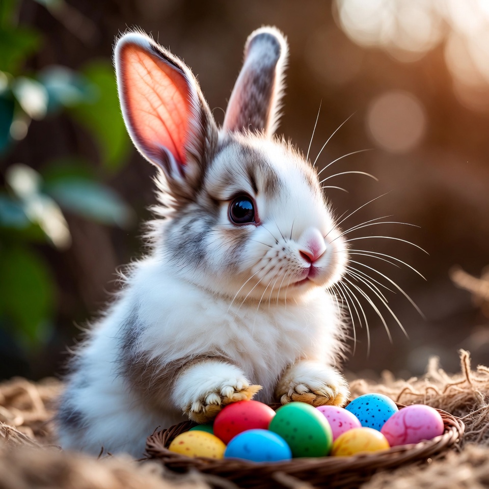 A fluffy white and gray bunny sits on a bed of straw holding a woven basket filled with colorful Easter eggs. The rabbit has large pink ears, bright eyes, and a gentle expression. Soft sunlight filters through green leaves in the blurred background.