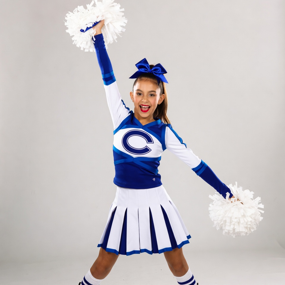 A young girl with long brown hair and a large bow performs a cheerleading pose on a gray background. She wears a white and navy blue cheerleader uniform with a large 'C' emblem, a pleated white skirt, and knee-high socks. She holds white pom poms in both hands raised high.
