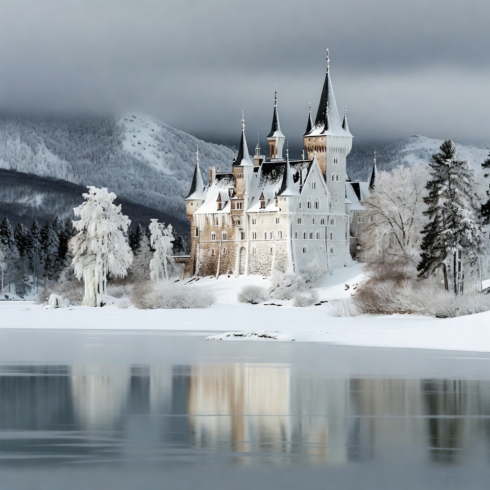 A majestic white castle with tall spires stands on a snowy hill beside a frozen lake. Snow-covered mountains and pine trees surround the castle under a cloudy sky. The castle's reflection is visible in the icy water.