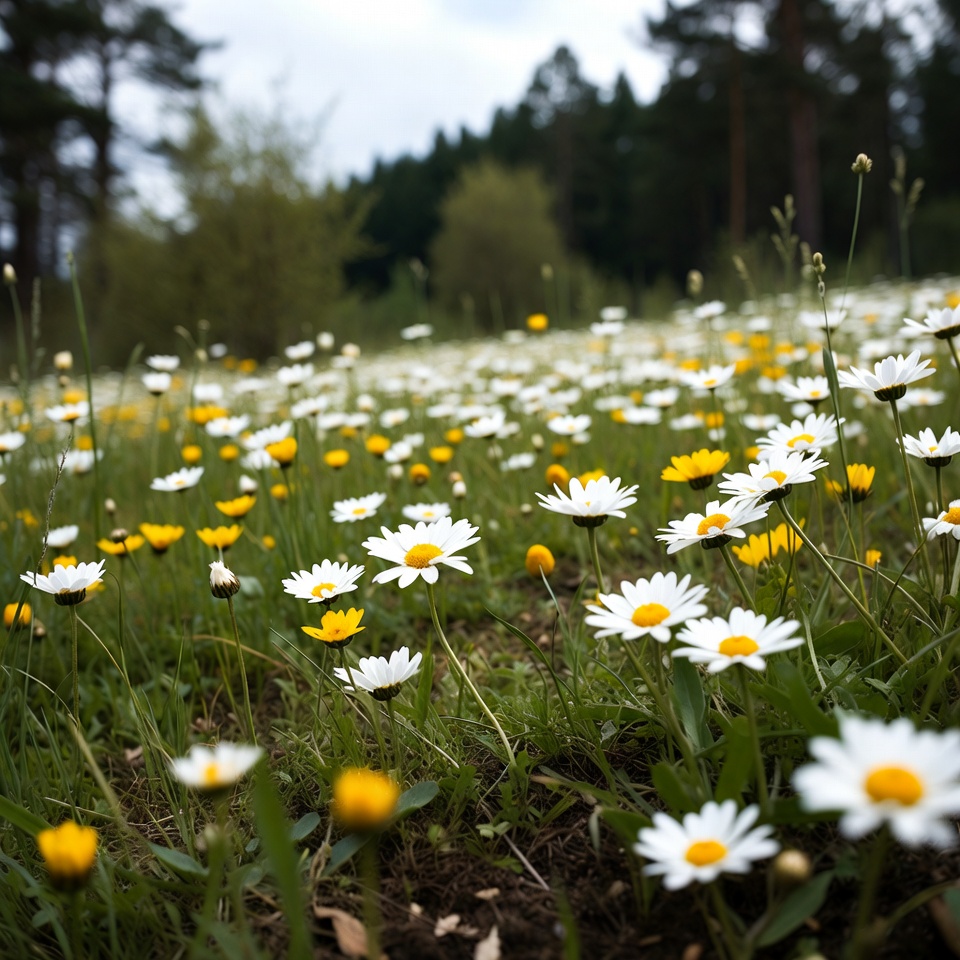 birch trees, blooms, bokeh, cloudy sky, floral landscape, flower field, forest edge, grass field, green grass, macro flowers, meadow, nature, outdoor, petals, pine forest, spring flowers, summer field, trees, white daisies, white flowers, wildflowers, woodland, yellow daisies, yellow flowers, daisies