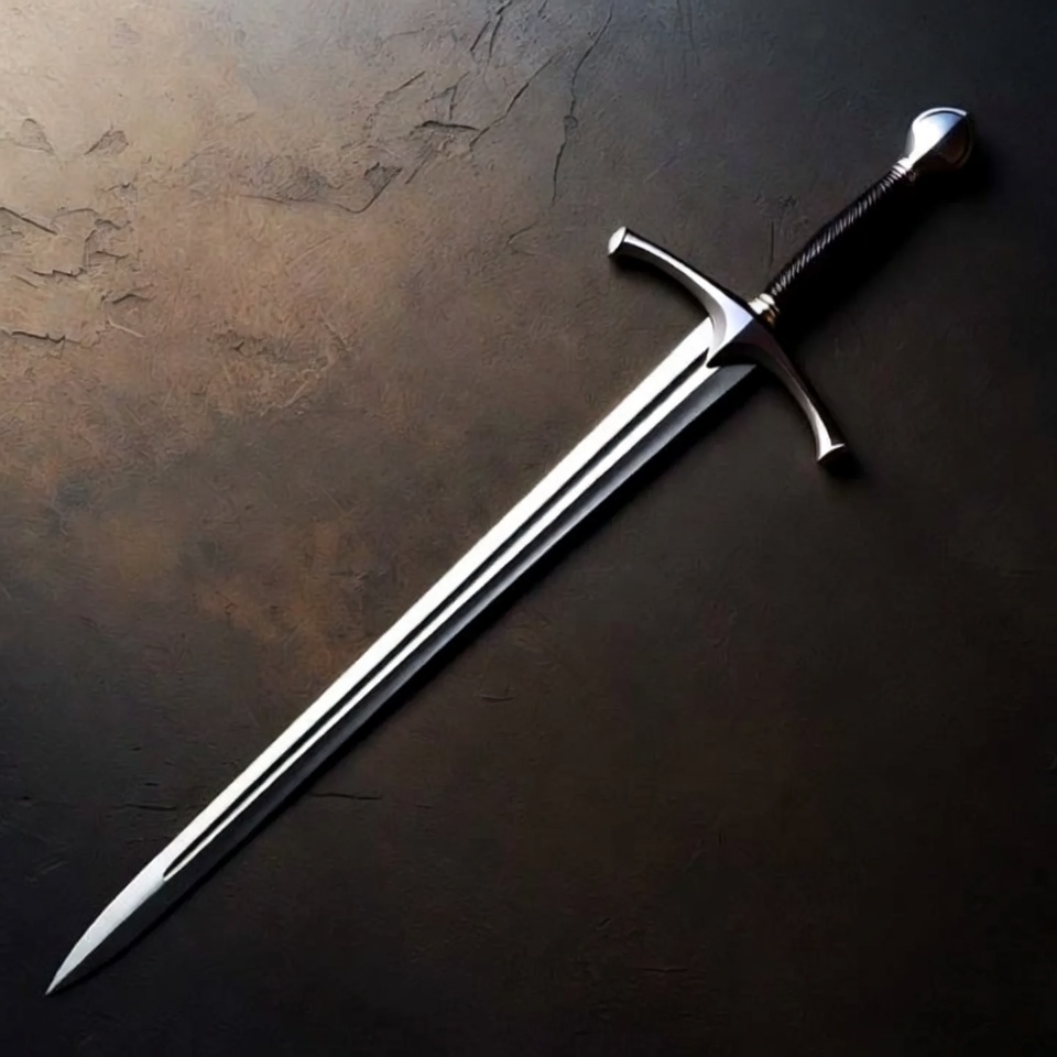 RPG sword, black hilt, blade, crossguard, dark background, dramatic lighting, fantasy sword, hilt, isolated, knight sword, longsword, medieval sword, metal sword, pommel, sharp blade, silver blade, steel sword, stone surface, weapon, sword