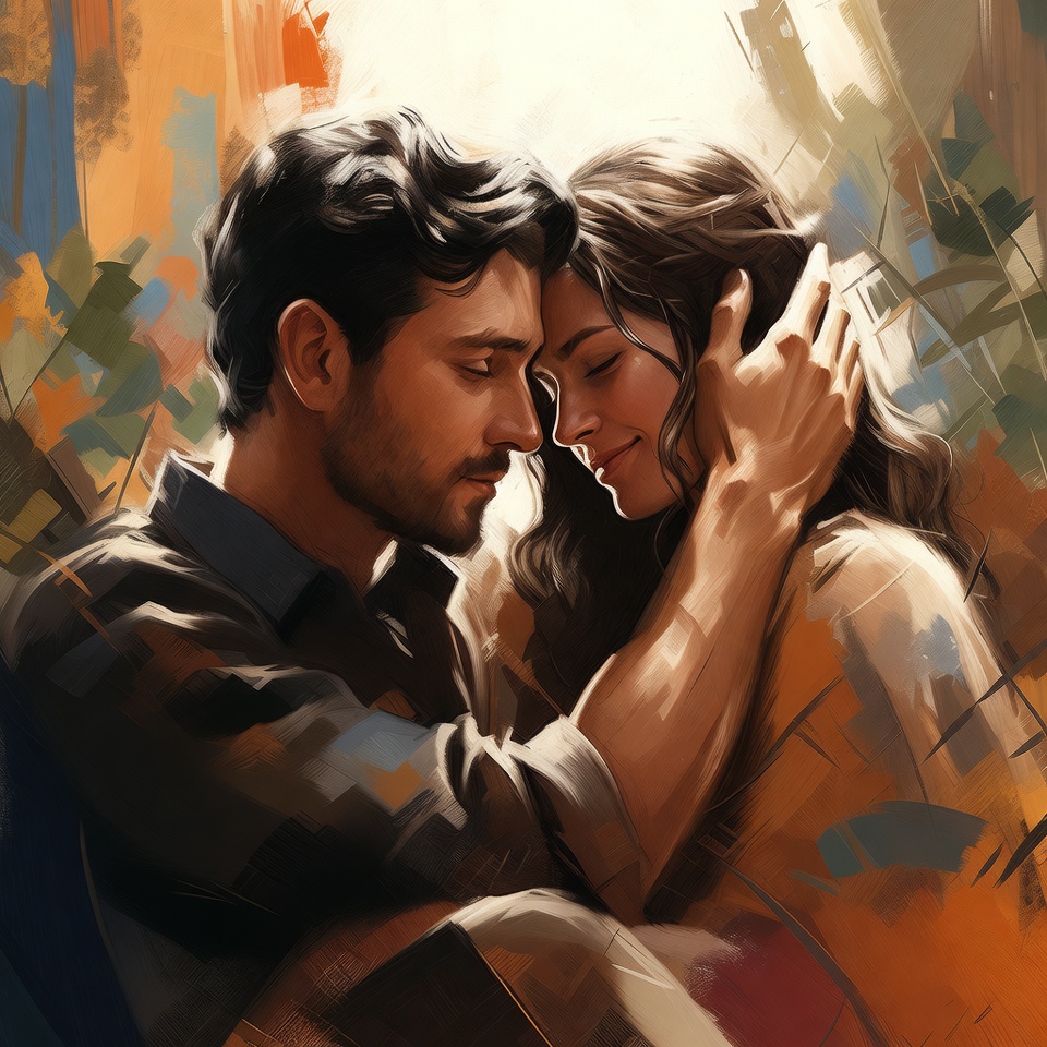 A digital painting depicts a man and woman in a close embrace with their foreheads gently touching. The man has dark wavy hair and a beard, wearing a dark shirt, while the woman has long brown hair and wears a light dress. They are surrounded by vibrant orange, teal, and green abstract brushstrokes on an isolated background.