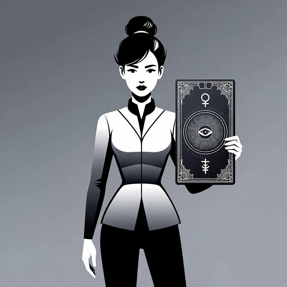 A black and white illustration depicts an Asian woman with hair in a bun, standing and holding a large tarot card. She wears a fitted outfit with a collared top and pants in grayscale tones. The tarot card features a central eye symbol, Venus glyph, and ornate black borders on an isolated background.
