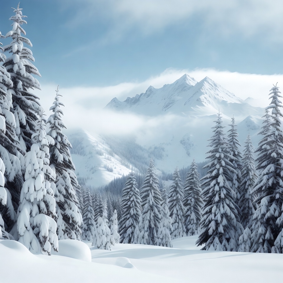 Snowy Pine Trees and Mountains