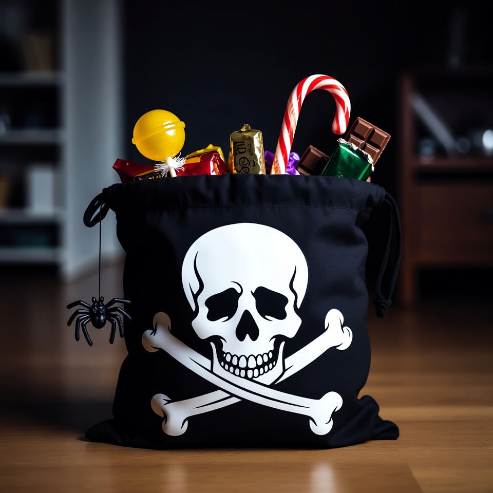 bag, black bag, bucket, candy, candy canes, chocolate, crossbones, dim lighting, drawstring, gold bells, isolated background, lollipops, pirate, shelves, skull, spider, spooky, sweets, treats, trick or treat, white skull, wooden floor, wrapped candy, yellow lollipop, Halloween