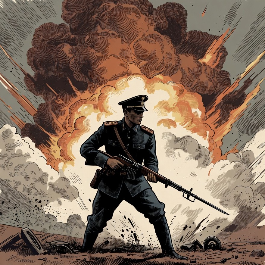 Soviet Soldier Amid Explosion