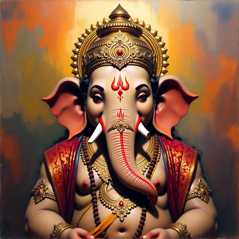 A detailed digital illustration of Lord Ganesha, the elephant-headed Hindu deity, with large ears, trunk, and tusks. He wears a golden crown, red and gold garments adorned with jewelry, and holds a staff. The figure is centered against a glowing orange gradient background.