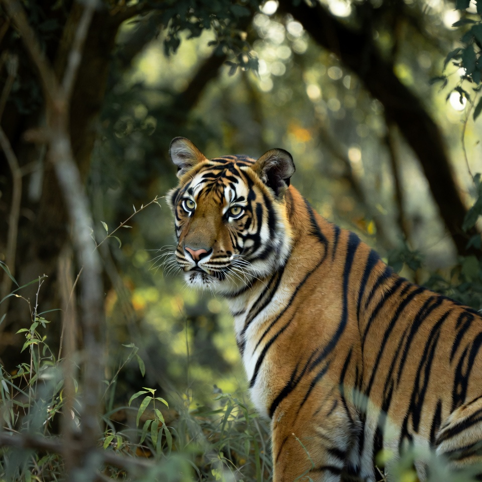 A majestic tiger with vibrant orange fur and black stripes stands alert in a lush green jungle. Surrounded by thick green leaves and branches, it gazes sideways with intense yellow eyes. The background is blurred, emphasizing the tiger against the natural forest setting.