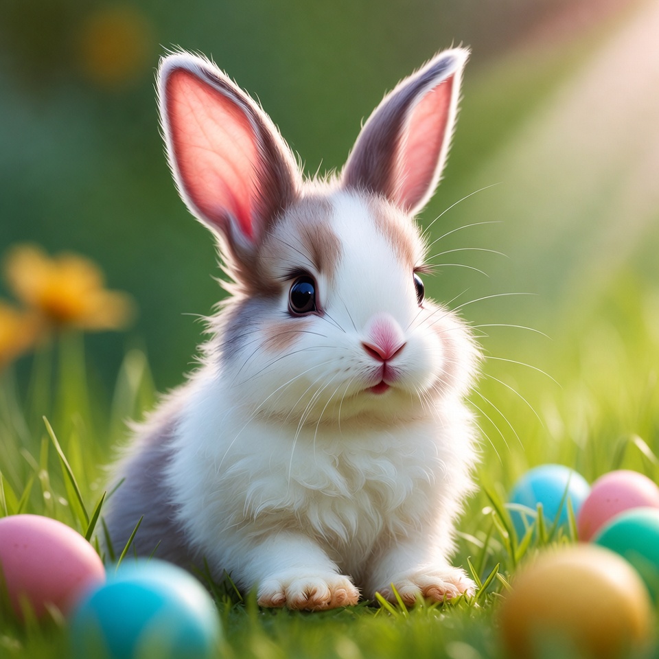 A fluffy gray and white baby bunny sits on green grass surrounded by colorful Easter eggs in pink, blue, yellow, and green. The bunny has large pink inner ears, big expressive eyes, and a small pink nose. Yellow flowers bloom in the soft blurred background.