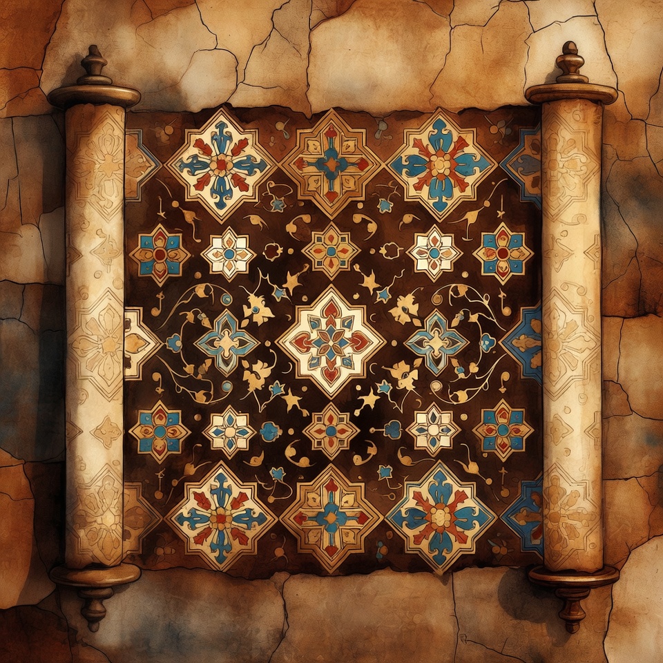 Islamic art, Persian design, ancient scroll, arabesque design, art nouveau, brown wall, decorative scroll, floral designs, geometric patterns, gold accents, illustration, isolated background, ornate scroll, red motifs, star shapes, teal patterns, textured wall, vines, vintage scroll, wooden rollers, scroll
