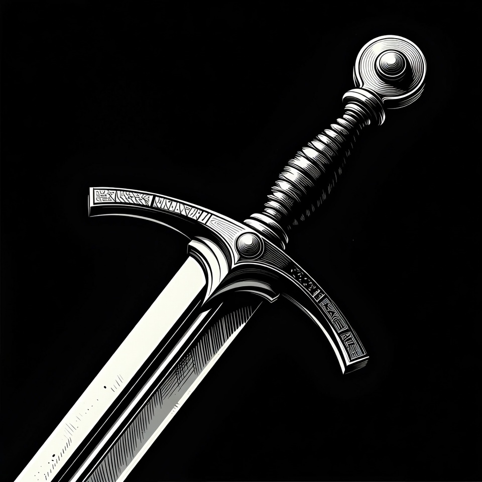 A detailed medieval longsword with ornate engravings on the crossguard and pommel is centered against a solid black background. The blade features intricate line art shading, giving it a metallic sheen. The hilt includes twisted grips and geometric patterns.