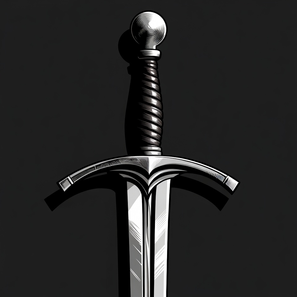 A detailed line art illustration of a medieval sword with a twisted grip and crossguard is centered against a solid black background. The blade shines with metallic highlights and shadows. The sword points downward with a prominent spherical pommel at the top.
