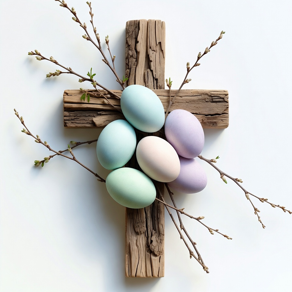 Colorful pastel Easter eggs in shades of green, pink, and blue are arranged on a rustic wooden cross. Delicate green twigs with buds extend from the cross, adding a natural touch. The composition is centered on a plain white background.