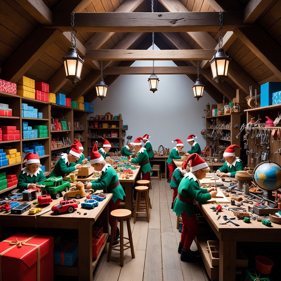 Multiple elves in green outfits and red hats work diligently at wooden workbenches in a cozy wooden workshop. They craft toys like trucks and globes amid shelves stocked with colorful gift boxes. Lanterns illuminate the beamed ceiling and wooden floor.