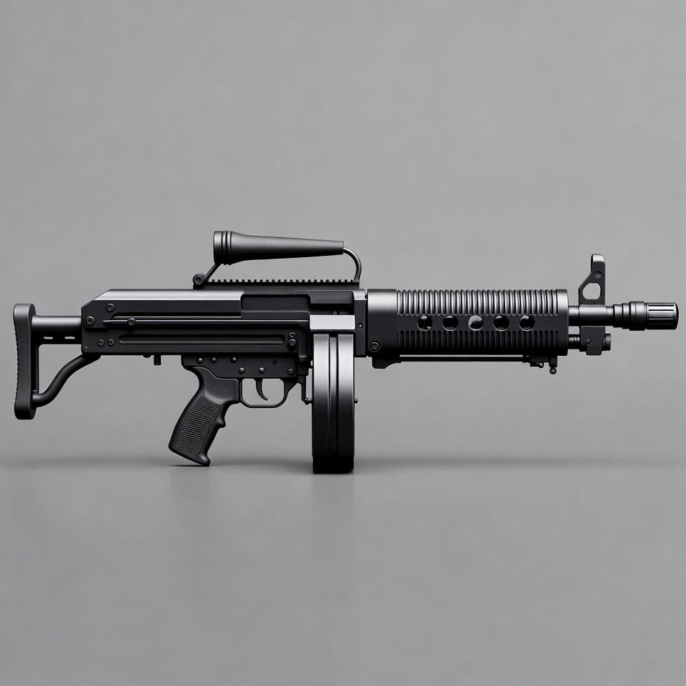 3D render, Picatinny rail, SMG, automatic weapon, black rifle, collapsible stock, drum magazine, firearm, flashlight mount, gun, handguard, isolated background, machine gun, military gun, pistol grip, submachine gun, tactical weapon, assault rifle