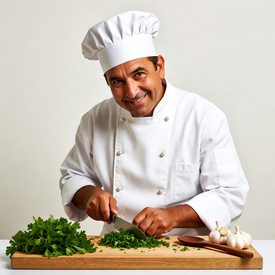 A smiling Latino man wearing a white chef's hat and uniform chops fresh parsley on a wooden cutting board. Garlic bulbs and a wooden spoon sit beside the chopped herbs on the table. He holds a knife in both hands against a plain white background.