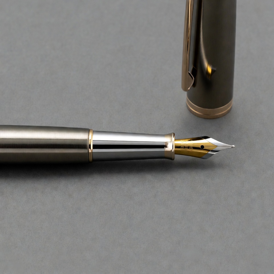 A luxury fountain pen in gunmetal gray with gold accents lies open on a gray surface. The pen cap rests beside it, revealing the shiny gold nib and feed. Fine details include polished trim and a clip on the cap.