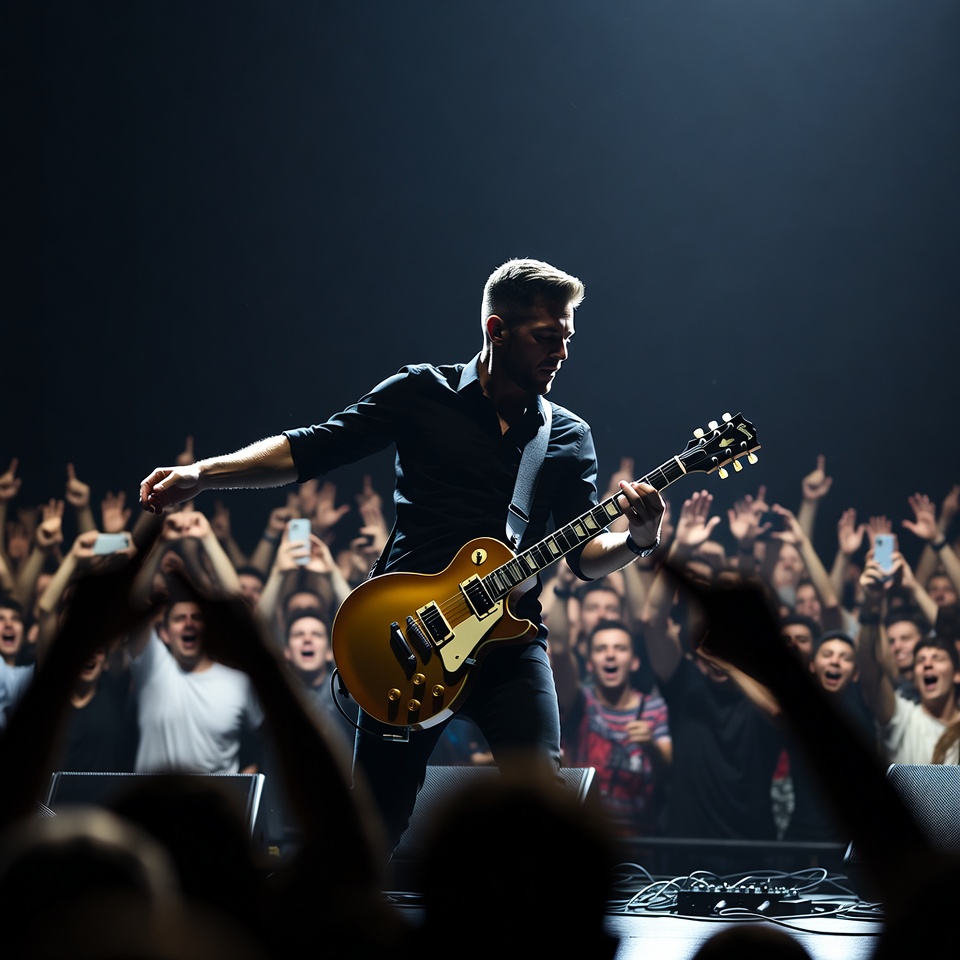 Les Paul, White, audience, black shirt, cheering fans, concert, crowd, dark background, electric guitar, energetic, guitar player, live performance, male, musician, performance, playing guitar, raised hands, rock concert, rockstar, smartphones, spotlights, stage, man