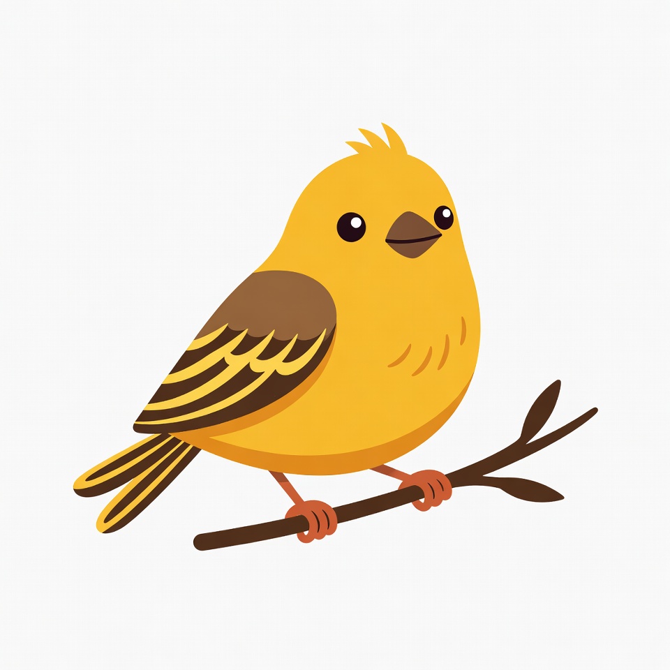 A cute cartoon yellow bird with big eyes and brown wings perches on a small branch. The bird features a fluffy yellow body, striped wings, and orange feet. It stands against a white background.