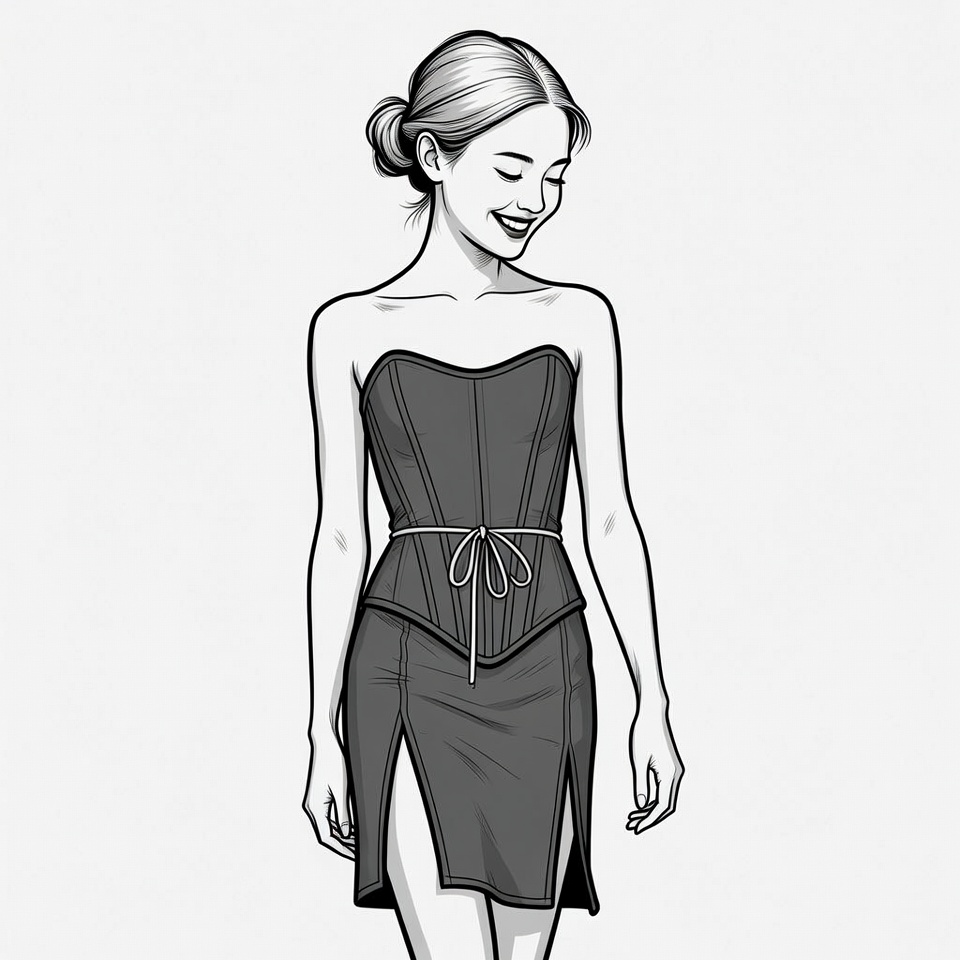 blonde hair, bun hairstyle, corset, drawing, elegant, fashion, female, happy expression, illustration, isolated background, line art, portrait, short skirt, sketch, slit skirt, smiling, strapless corset, woman, young woman, Asian woman
