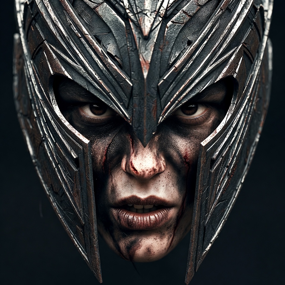 armor helmet, black background, blood smeared, close-up portrait, dark makeup, fantasy warrior, fierce expression, grime face, helmet, illustration, intense glare, metal helmet, ornate helmet, warrior, female warrior