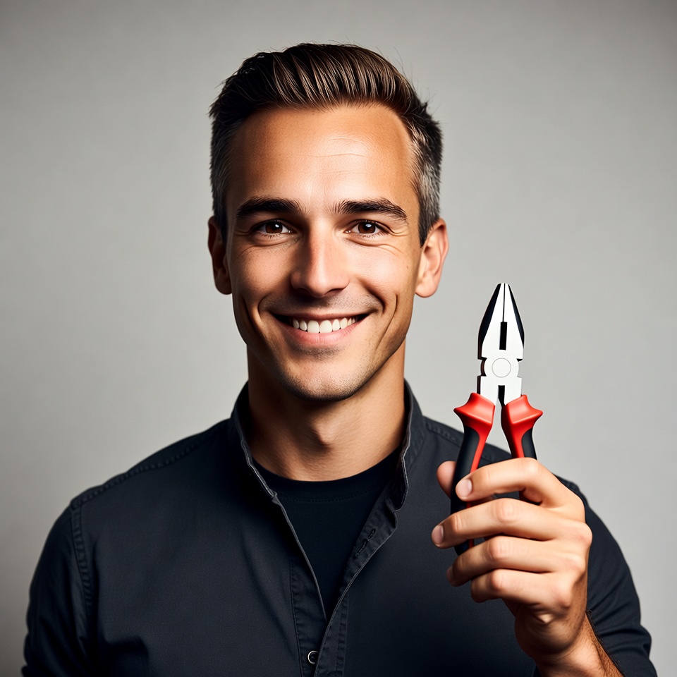 A young White man with short dark hair smiles confidently while holding red-handled pliers in his right hand. He wears a black collared shirt and stands against a plain gray background. His expression is friendly and direct to the camera.
