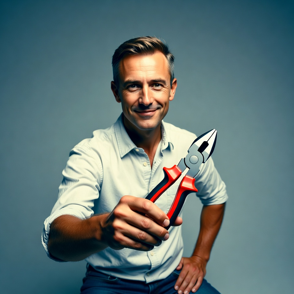 A middle-aged White man with short graying hair smiles confidently while holding a pair of red-handled pliers in his right hand. He wears a light blue button-up shirt and dark jeans, posed against a plain gray background. His left hand rests on his knee in a casual seated position.