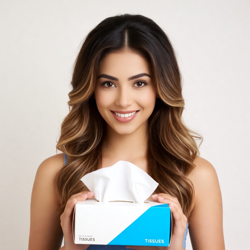 A young woman with long wavy brown hair smiles while holding a blue and white tissue box in front of her. She wears a sleeveless top and stands against a white background. She pulls out a white tissue from the box.
