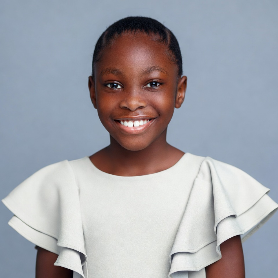 A young African-American girl with short braided hair smiles happily at the camera against a plain gray background. She wears a white blouse with ruffled shoulders and puffed sleeves. Her bright eyes and wide smile convey a cheerful expression.