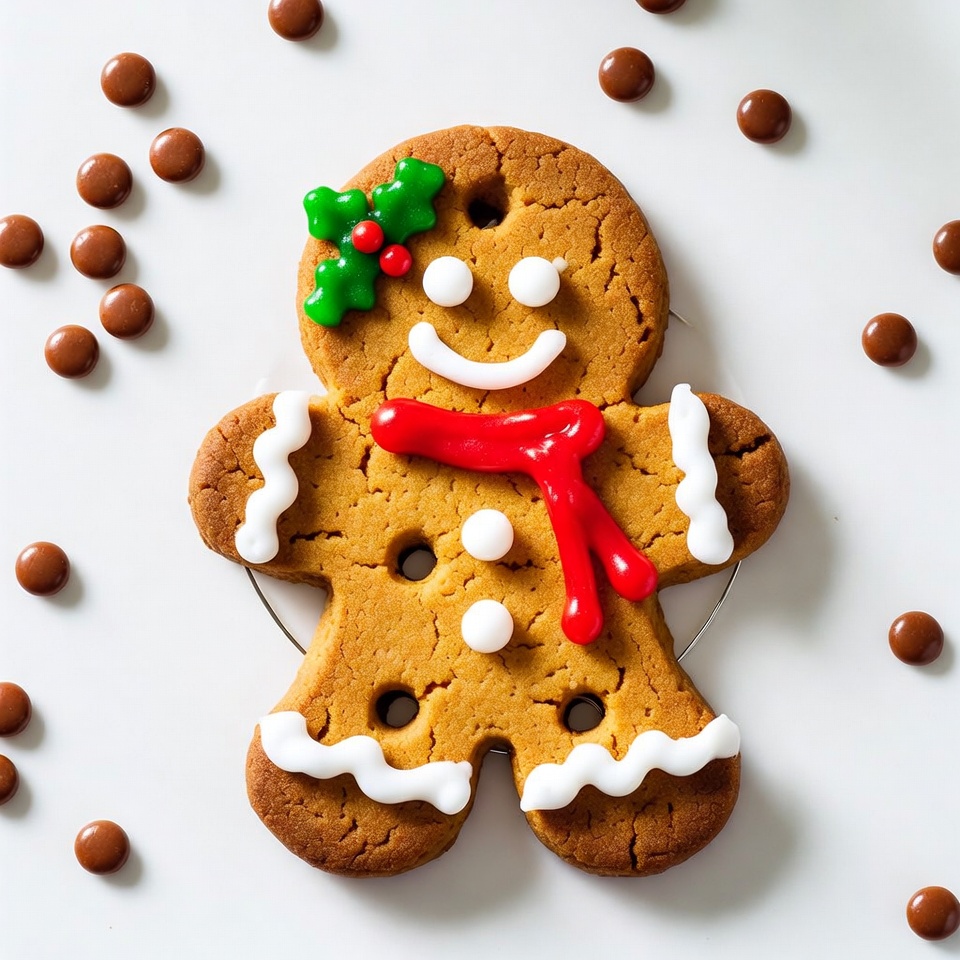 A gingerbread girl cookie lies on a white surface surrounded by chocolate candies. She wears a red scarf, holly decoration on her head, and white icing details. The cookie is shaped within a round cutter.