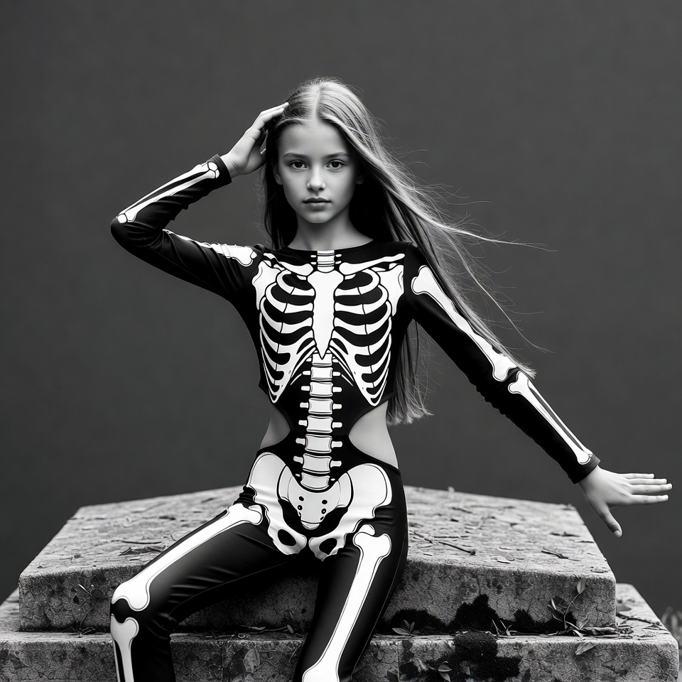 A young girl with long blonde hair wears a tight black skeleton bodysuit featuring white bone designs on a dark background. She sits on stone steps with one hand touching her hair and the other extended, her hair flowing in the wind. The black and white photograph highlights the detailed costume and her serious expression.