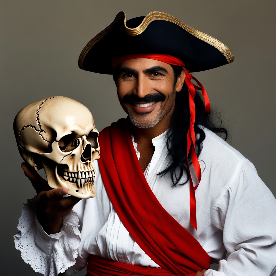 Middle Eastern, costume, goatee, holding skull, isolated background, long hair, man, mustache, pirate costume, pirate hat, red bandana, red sash, ruffles, skull, smiling, tricorn hat, white shirt, pirate