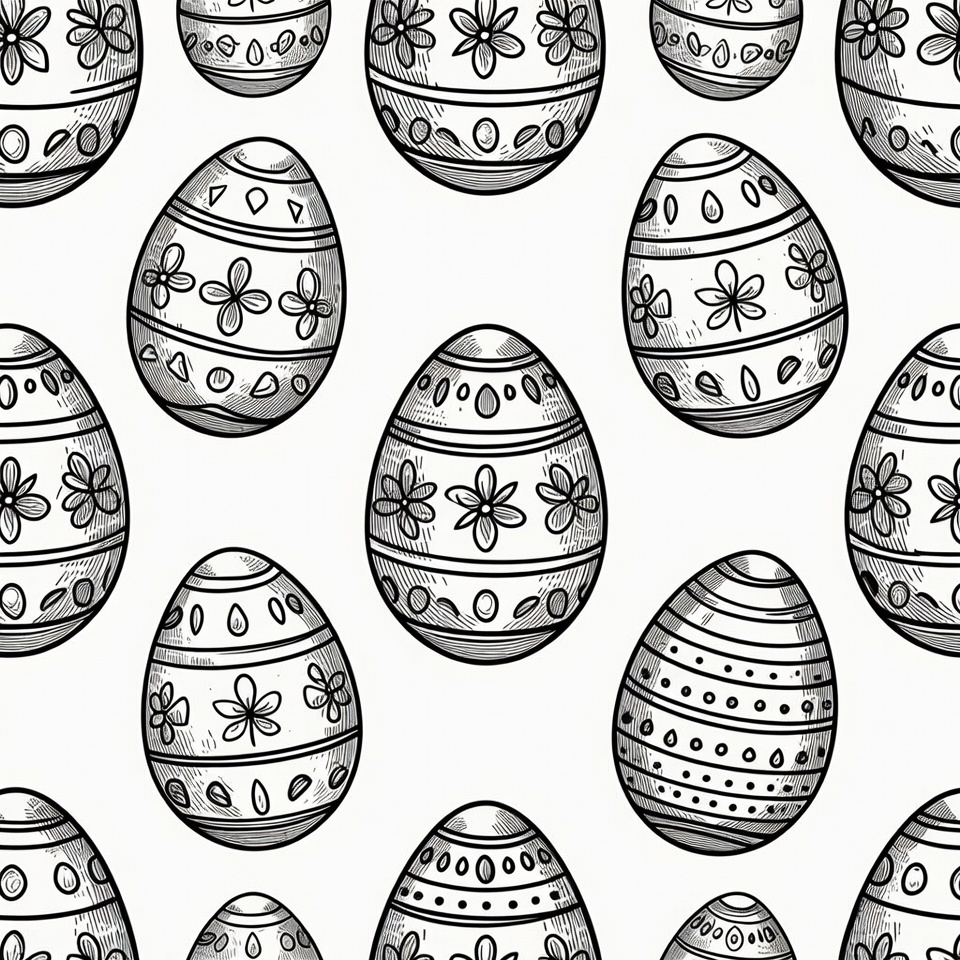 A seamless pattern features numerous black and white line art Easter eggs on a white background. Each egg is intricately decorated with floral designs, dots, and stripes. The eggs are arranged in a repeating grid layout.