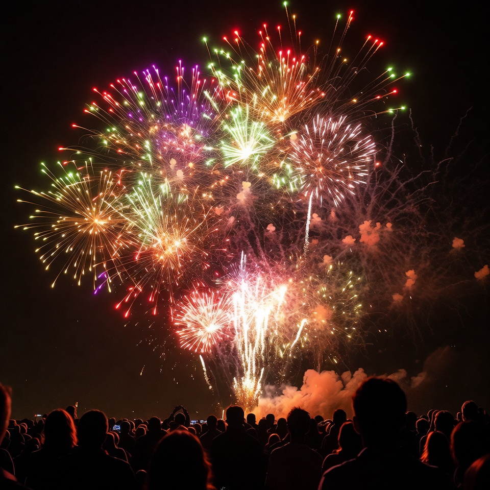 bursting fireworks, cameras, celebration, colorful fireworks, crowd, crowd watching, dark background, explosion, festive, fireworks display, green fireworks, night, night sky, people silhouettes, phones raised, purple fireworks, pyrotechnics, red fireworks, silhouetted crowd, sky lights, watching fireworks, yellow fireworks, fireworks