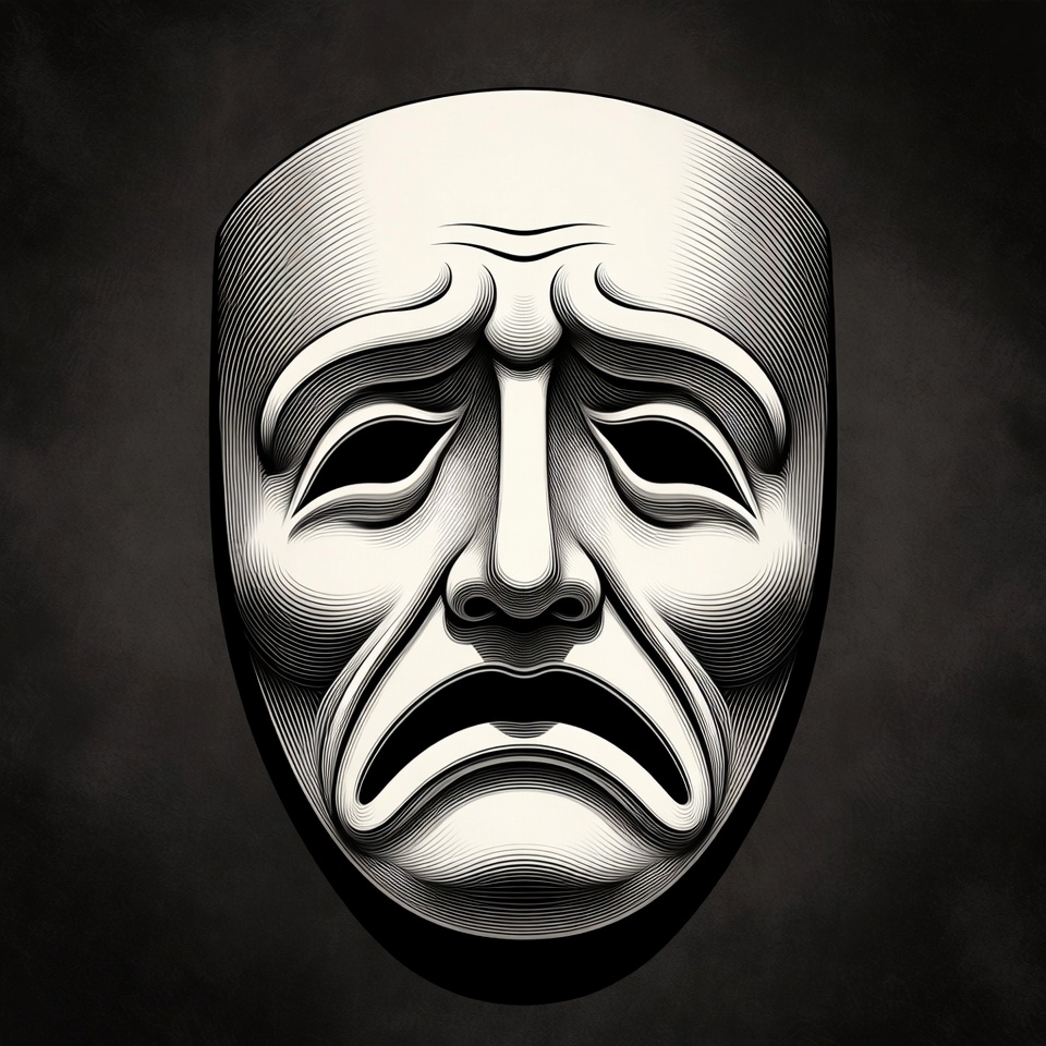 A detailed line art illustration of a white tragedy mask with exaggerated sad features. The mask shows deep furrowed brows, hollow eyes, and a wide downturned mouth on a dark background. It is rendered in a classic theatrical style with intricate shading.