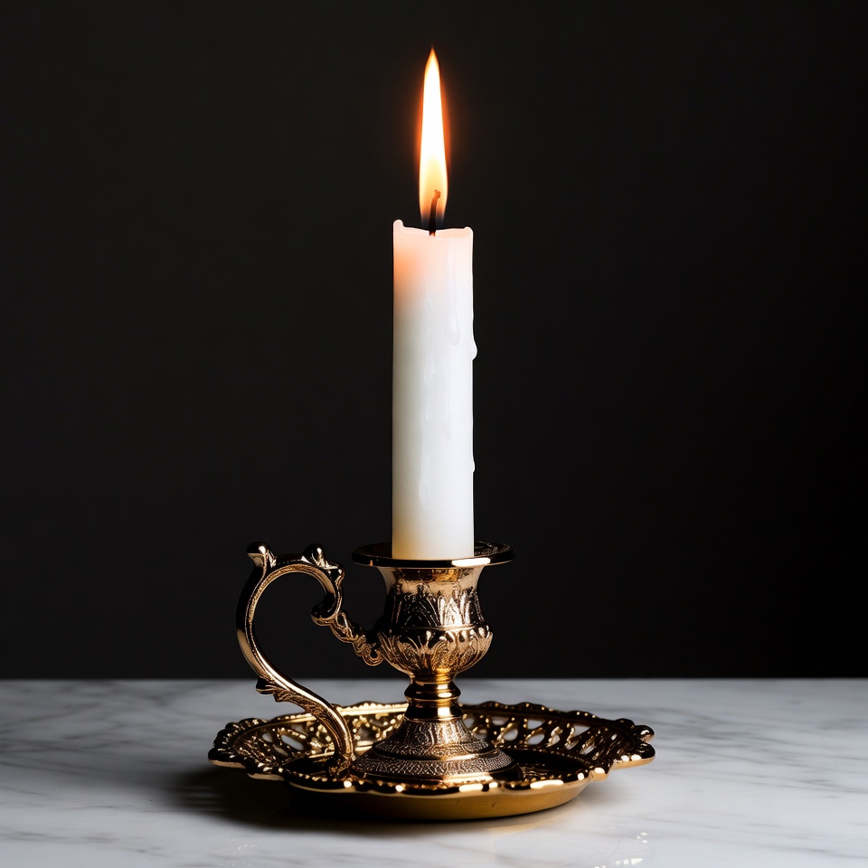 A white candle with a bright flame burns in an ornate gold candlestick on a white saucer. The candlestick features intricate filigree designs and a curved handle. The scene is set against a dark background on a reflective white surface.