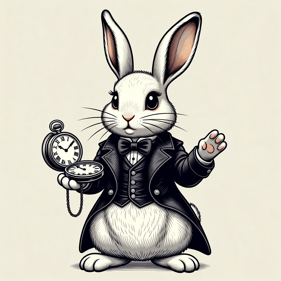 Alice in Wonderland, anthropomorphic rabbit, black suit, bow tie, bunny, chain watch, clipart, cute animal, formal attire, illustration, isolated background, pocket watch, rabbit, standing rabbit, timepiece, tuxedo, vintage style, waving paw, white rabbit character, white rabbit