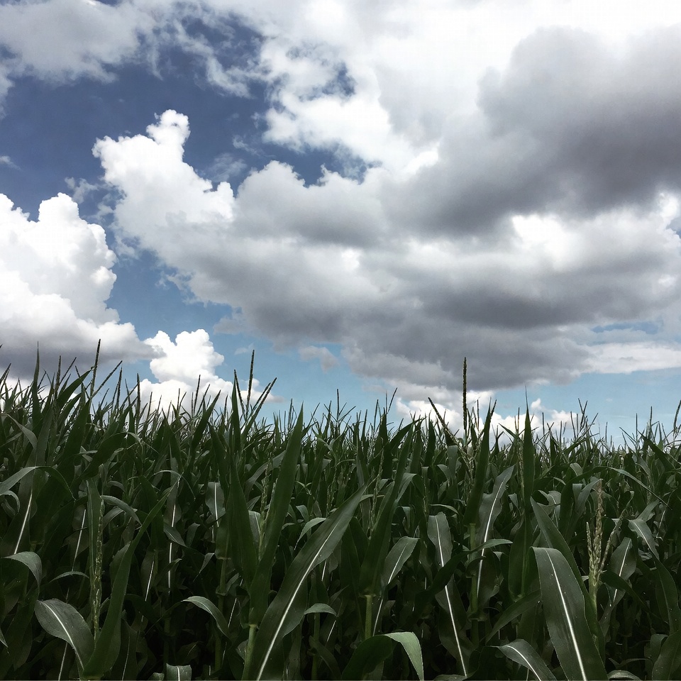 agriculture, blue sky, clouds, cloudy sky, corn crop, corn stalks, crops, farm field, farmland, field, gray clouds, green corn, maize, nature, outdoor, sky, summer sky, tall plants, white clouds, corn field