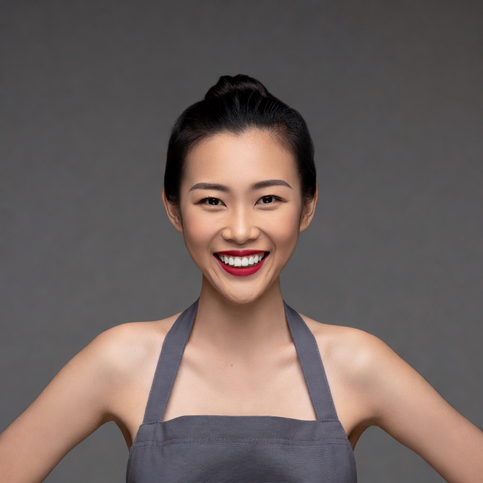 A young Asian woman with black hair in a bun smiles brightly at the camera. She wears a gray sleeveless apron over her shoulders with arms extended outward. The image features a plain gray background.