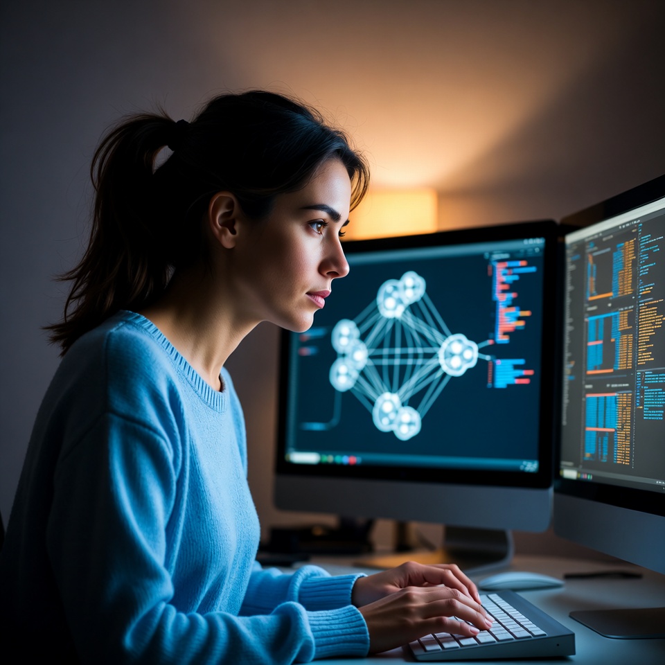 A woman with dark hair in a ponytail wears a light blue sweater while working at a desk with dual Apple monitors in a dimly lit room. She types on a keyboard as colorful code and a network graph display on the screens, illuminated by a warm lamp. Her profile view shows concentration on the programming task.