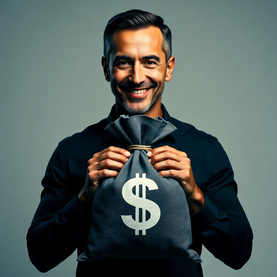 A smiling middle-aged Latino man with short dark hair and a goatee holds a large gray money bag marked with dollar signs. He wears a black dress shirt and stands against a plain gray background. His expression is joyful as he grips the bag with both hands.